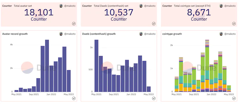 In comparison to ETH addresses which are automatically set at registration, the number of other record sets still has lots of space to grow. Avatar record in particular has grown a lot in April, almost similar growth ratio to the last November whereas decentralised web (aka Dweb) and other cryptocurrencies have decreased slightly.