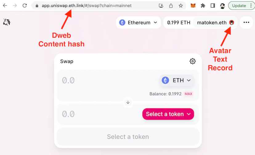 Dweb provides decentralized hosting via IPFS and Avatar text record shows up on Dapps such as Uniswap to show the avatar record you associated with your ENS name set as your primary name.