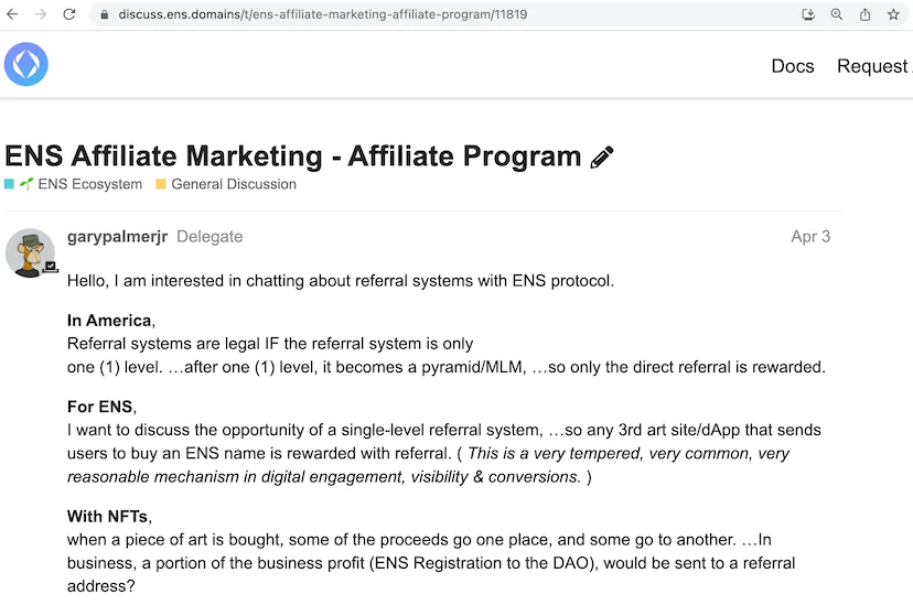There is also a discussion about creating an affiliate program targeted for content creators but the program can be also useful for Dapp integrations. It not only incentivise Dapps to integrate with us but also it will give good data insight about which projects bring more users to ENS (either offchain data like google analytics, or onchain data if we decide to handle it on chain).